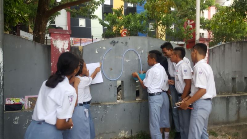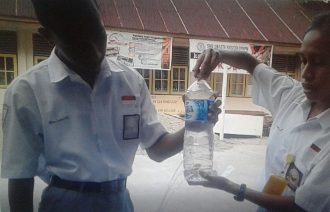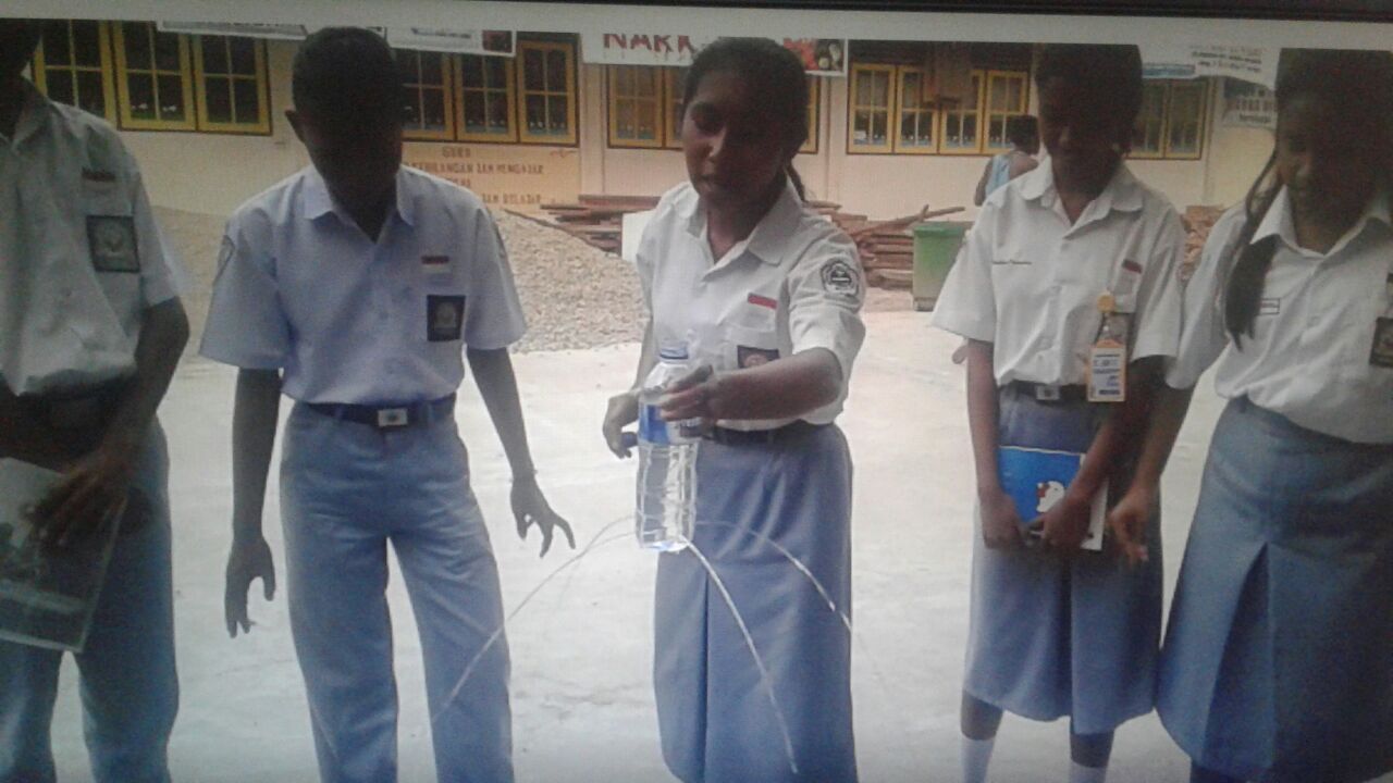 1.1. Kelompok yang pertama dan ketiga mendapat tugas membuat selang berbentuk huruf U dengan salah satu bagian ujung selang diberi corong dilapisi dengan perekat, kelompok pertama ditempelkan selangnya pada dinding tembok pagar sekolah sedangkan kelompok tiga selangnya di tempelkan pada sepotong papan tripleks,selang yang berbentuk huruf U tersebut diisi air, kemudian bagian ujung yang telah direkat dengan corong dimasukin ke dalam wadah ( Loyang ) yang berisi air, setelah semuanya jadi maka masing-masing kelompok mempresentasikannya.