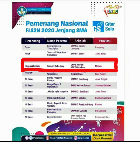 Selamat buat Frengky Tuhumury , terus mengasah bakatmu untuk Maluku, kami pihak sekolah mengcapkan terima kasih dan apresiasi yang luar biasa bagi anak kami terkasih ujar snag Nakhoda sekolah Dra E Laturiuw, M.Si kepada tim media sekolah