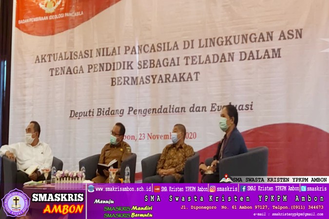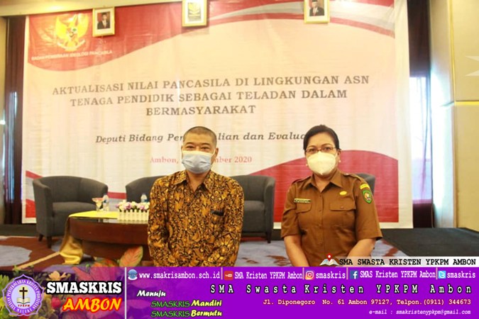 Bertempat di SwisBell Hotel Ambon Sosialisasi Aktualisasi Nilai Panca Sila di lingkungan ASN Tenaga Pendidik sebagai teladan dalam masyarakat diikuti oleh kurang lebih 80 peserta yang terdiri dari Kepala SMA/ SMK Negeri dan Swasta beserta guru. Kepala SMA Kristen YPKPM Ambon Dra .E.Laturiuw M.Si hadir juga sebagai peserta sosialisasi