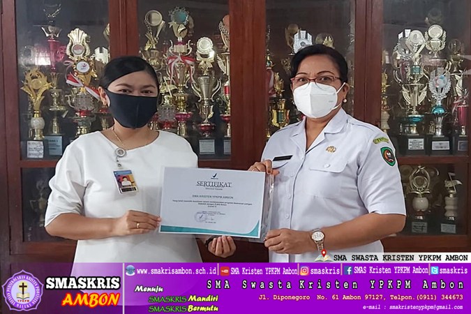 Kepala SMA Kristen YPKPM Ambon Dra E Laturiuw, M.Si yang di dampingi oleh Ketua TIM KEAMANAN PAGAN SEKOLAH, Ibu L Liliefna, S.Pd menerima langsung Penyerahan sertifikat dari Ibu Sisca Yanti, Ssi, Apt ( Mewakili BPOM Propinsi Maluku )