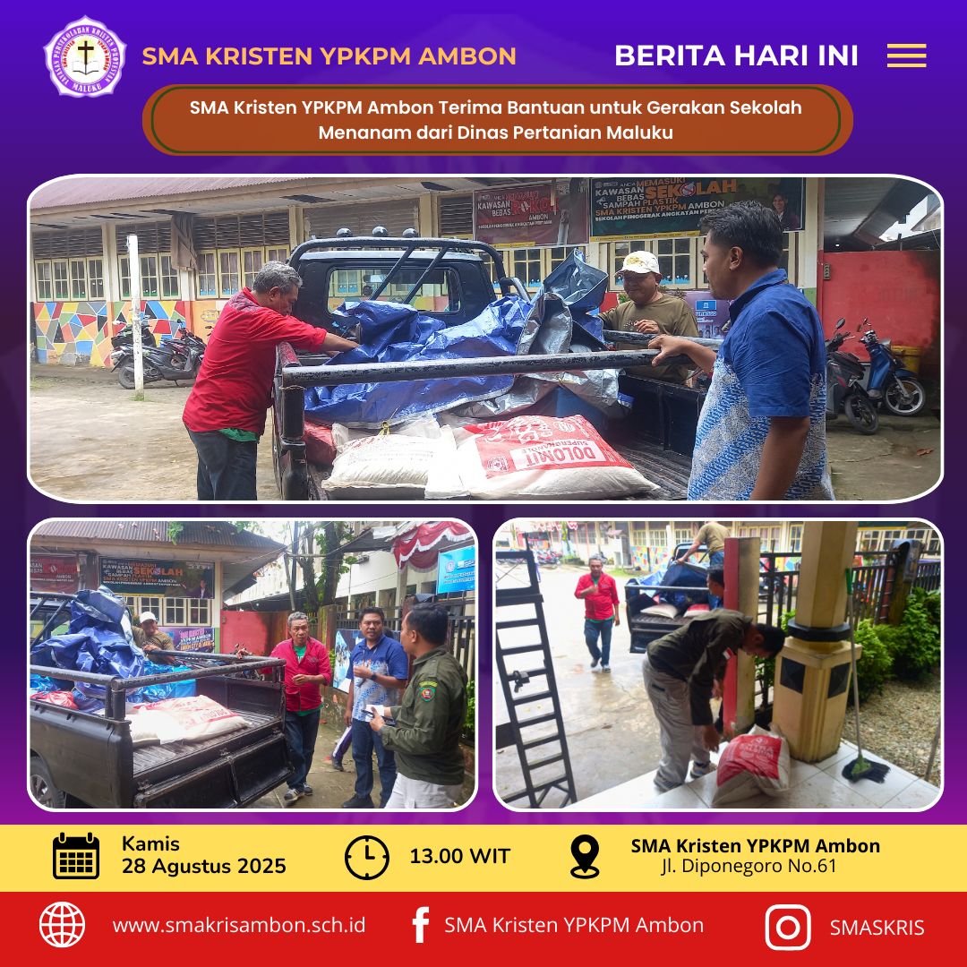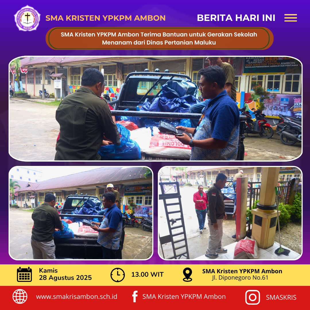 Ambon, 28 Agustus 2025_Sebagai bentuk komitmen dalam mendukung program Gerakan Sekolah Menanam (GSM), SMA Kristen YPKPM Ambon mendapatkan bantuan sarana penunjang dari Dinas Pertanian Provinsi Maluku. Bantuan yang diserahkan secara langsung tersebut berupa wadah plastik polibag (polybag) dan pupuk NPK padatan.