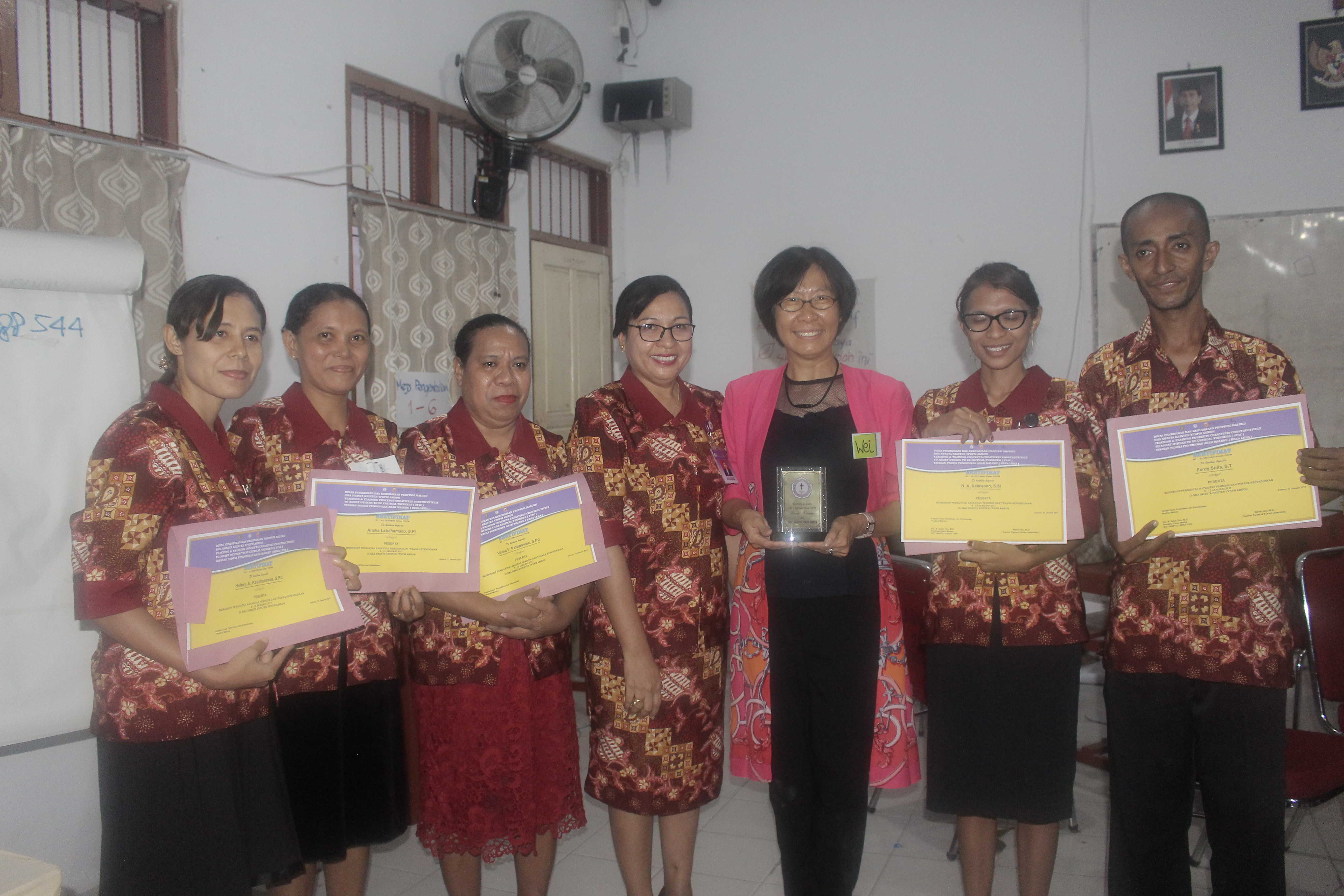 Dalam penutupan workshop ini diserahkan sertifikat kepada 5 wakil peserta, pemberian cindera mata kepada Ibu Wei panggilan akrab narasumber kita ini sekaligus sumbangan 2 buah buku inspiratif kepada sekolah sebagai motivasi harus dibaca warga SMASKRIS terutama para guru.